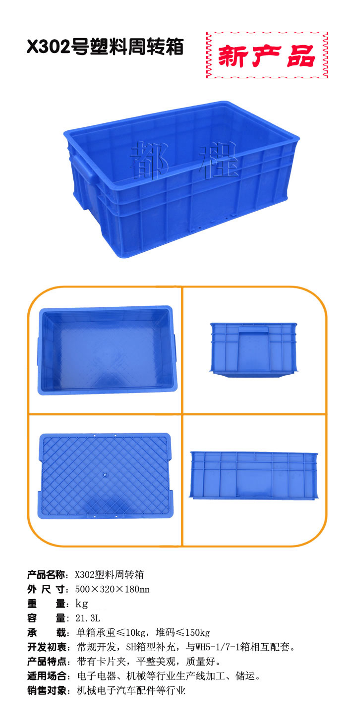 編號: X302 外尺寸(mm): 500*320*180 內(nèi)尺寸(mm): 473*292*170 內(nèi)容積(L): 21.3 備注: SH箱型補充開發(fā),與WH5-1/7-1箱相互配套,帶有卡片夾,平整美觀,適用于電子電器、機械等行業(yè)產(chǎn)線加工、儲運。